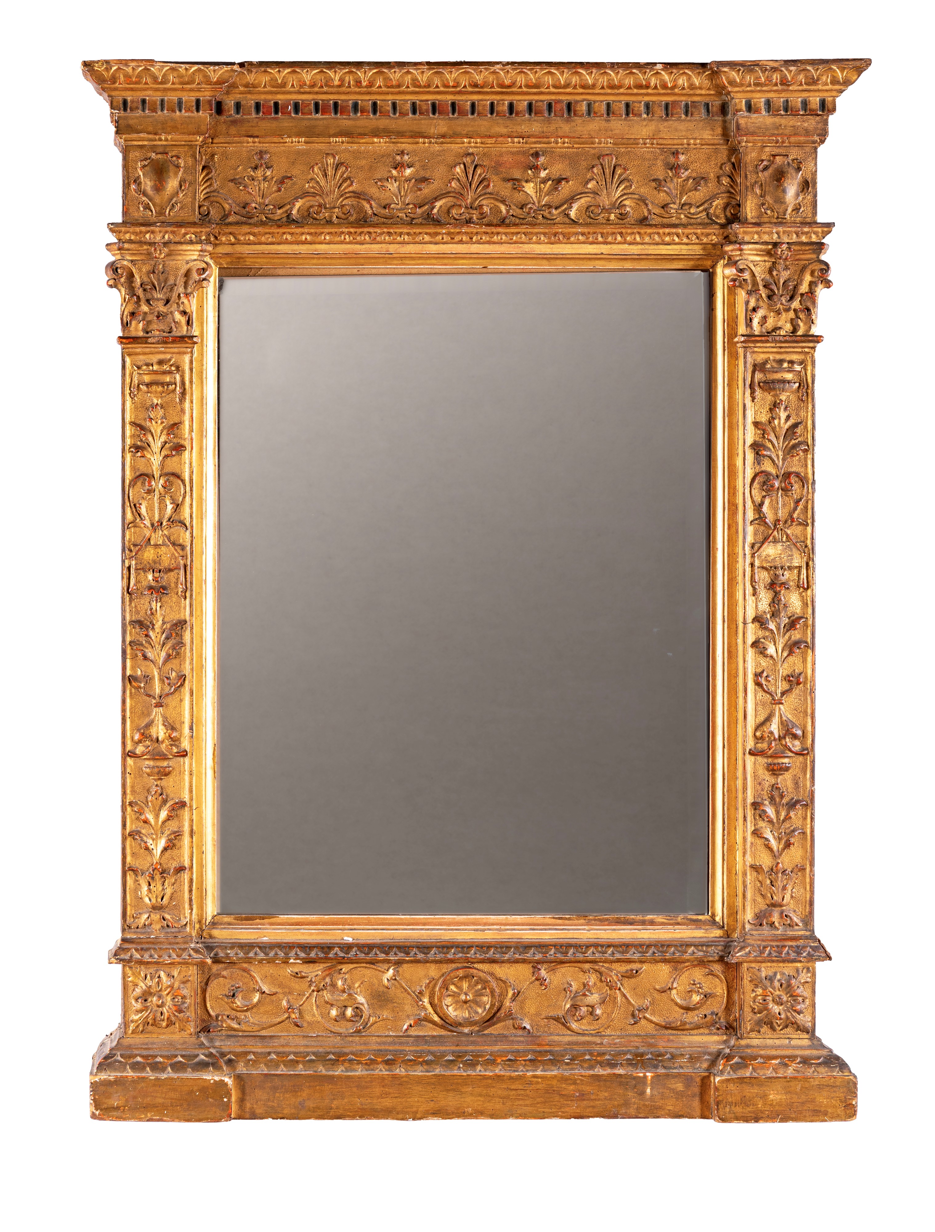 cornice a edicola decorata da motivi vegetali in bassorilievo; paraste laterali con candelabre