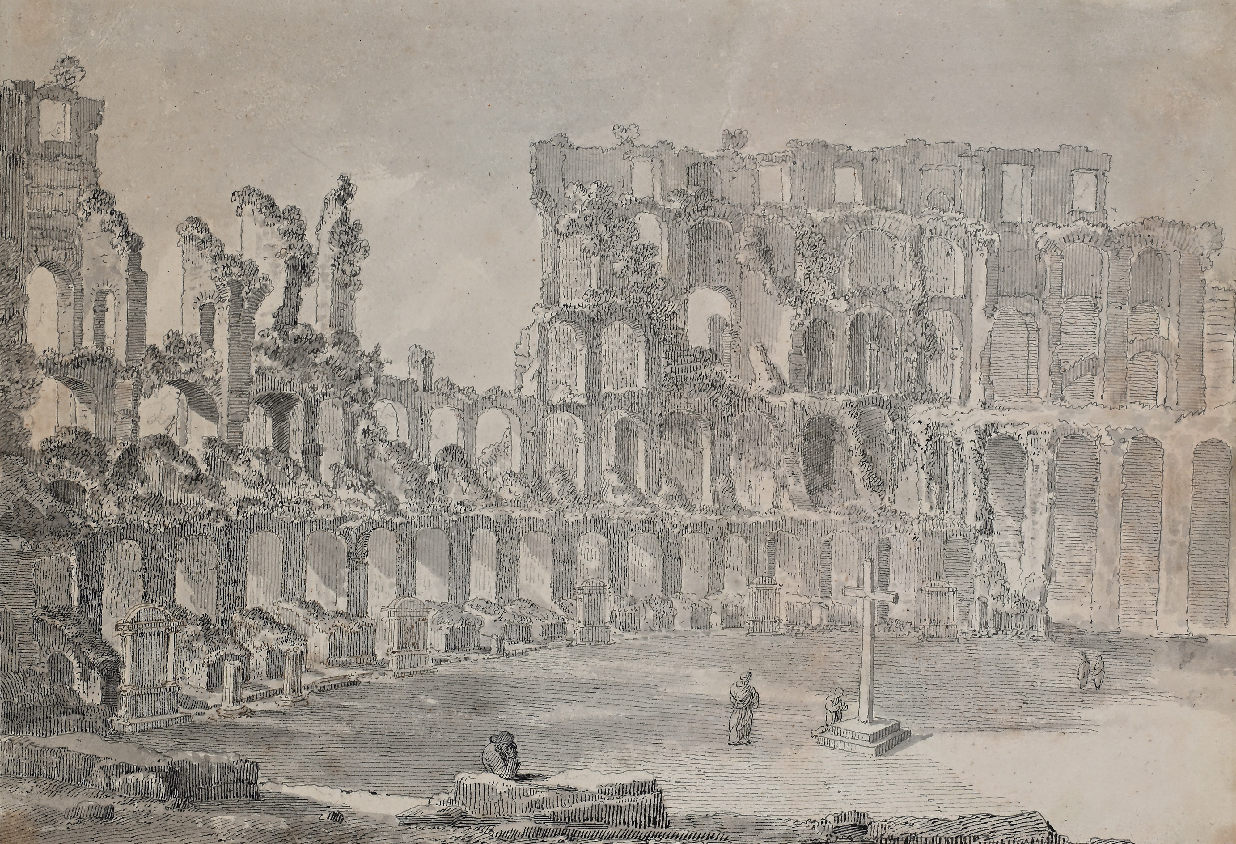 Veduta dell'interno del Colosseo con personaggi in preghiera