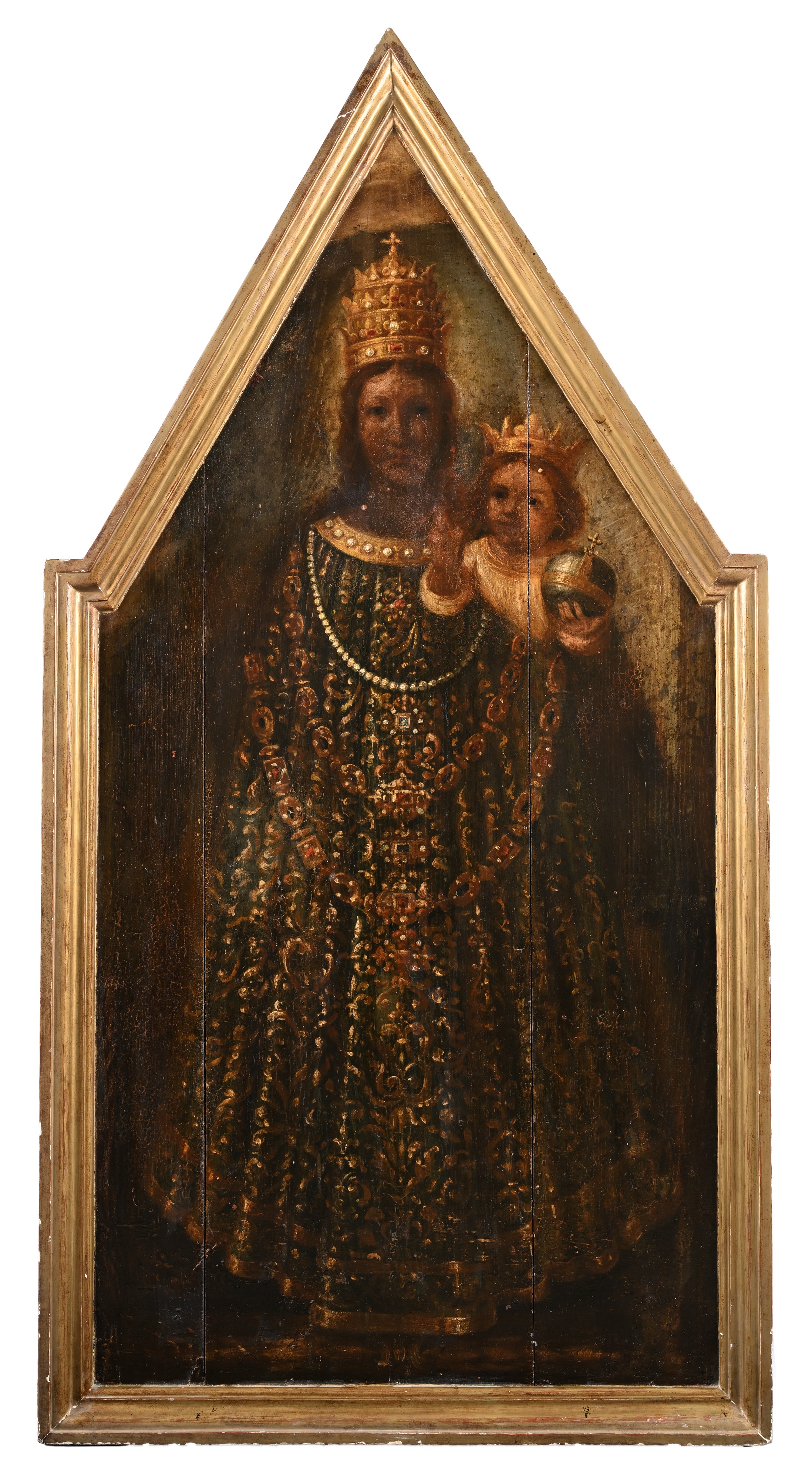 Si riporta di seguito un estratto della scheda del Prof. Marco Ciampolini "L’opera è dipinta su di una tavola cuspidata come quella dei pannelli dei polittici del Trecento e del primo Quattrocento. Vuole infatti essere una sorta di icona dal forte valore devozionale. Si dà importanza alla preziosità dell’abito e persino ai gioielli che vi sono appesi. Potrebbe trattarsi di un’opera senese, infatti a Siena la Madonna di Loreto era molto venerata e a lei erano dedicate due cappelle, una in Palazzo Pubblico, l’altra nel Palazzo del governatore granducale in piazza del Duomo. Potrebbe trattarsi dell’opera di un pittore che si dedicava a pitture decorative o di arte minore. Il più attivo in questi campi a Siena nella prima metà del Seicento (tempo che sembra il più congruo per l’esecuzione dell’opera) fu Antonio Gregori, unito per parentela e legami di bottega alla famiglia Rustici"
