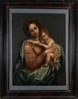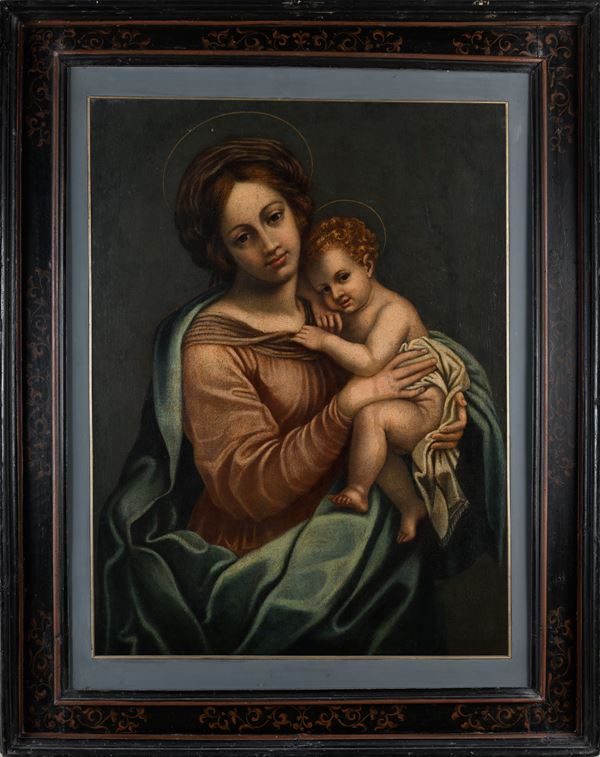 Opera riconducibile alla tradizione devozionale raffaellesca diffusa in area centro-italiana nel XVII secolo. La composizione, intima e raccolta, trova puntuale confronto nella produzione di Giovanni Battista Salvi, detto il Sassoferrato, e in analoghe tipologie documentate nell’Archivio Zeri, a conferma della fortuna e della diffusione di questo modello iconografico.