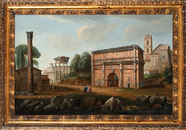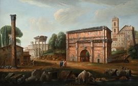 Veduta del Foro Romano con la colonna di Foca e l'arco di Tito