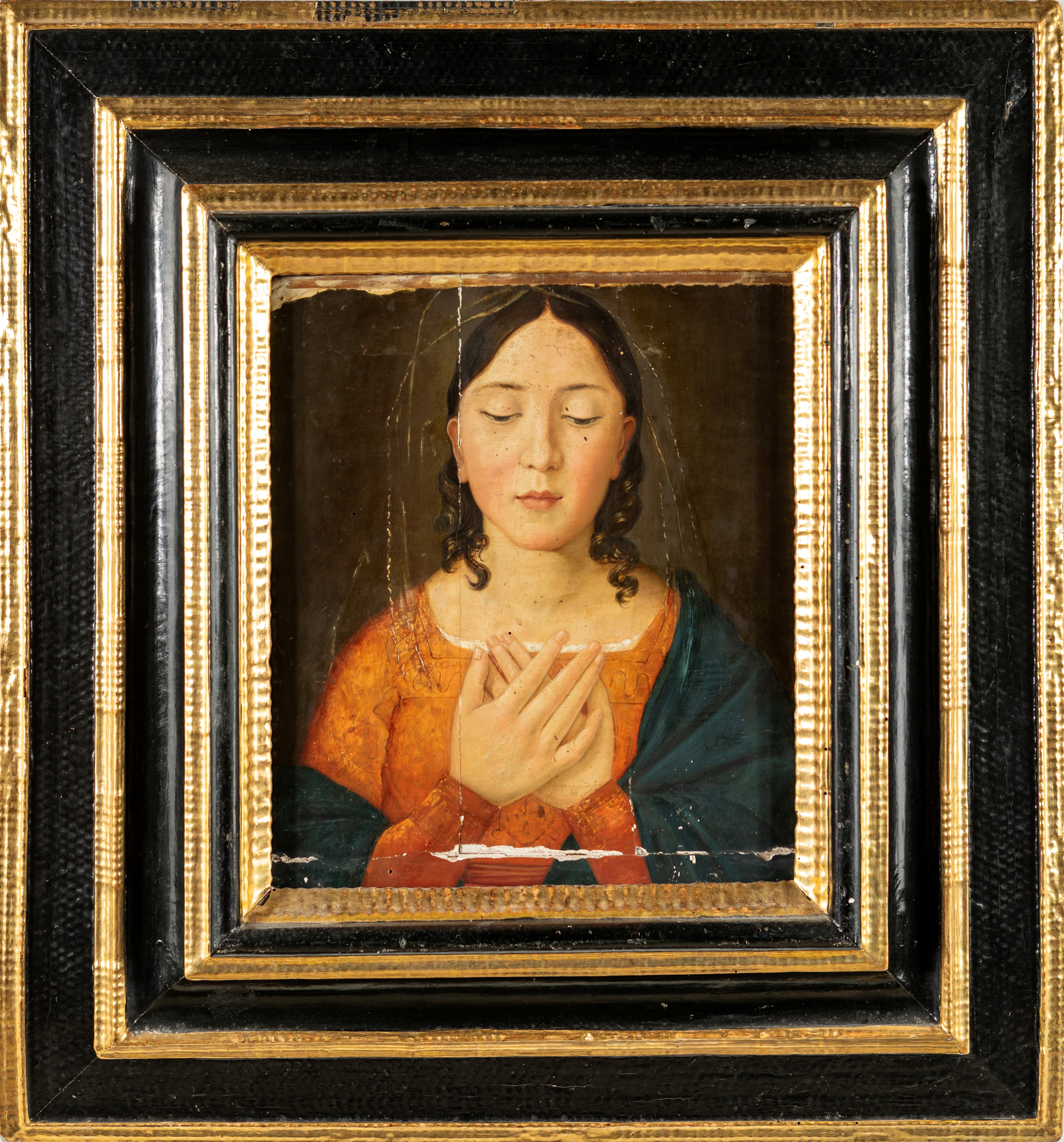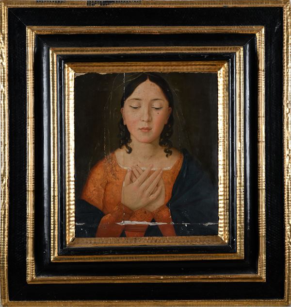 Raffigurata con lo sguardo rivolto in basso e le mani incrociate all'altezza del petto in un gesto che indica l'accettazione della volontà divina; entro antica cornice in legno ebanizzato con quattro ordini di intagli a trottola dorati