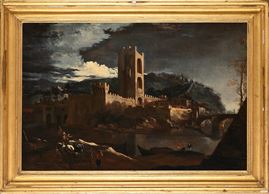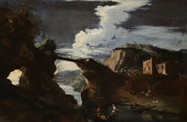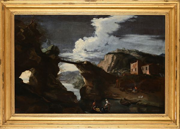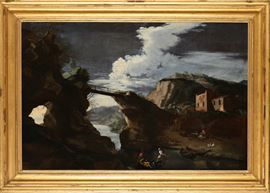a) Paesaggio con ponte e rocce, olio su tela, cm 59x87,5 - con cornice cm 74,5x104,5