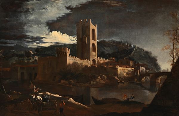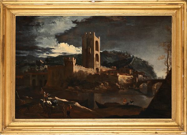 b) Paesaggio con ponte, olio su tela, cm 58x87 - con cornice cm 74,5x105