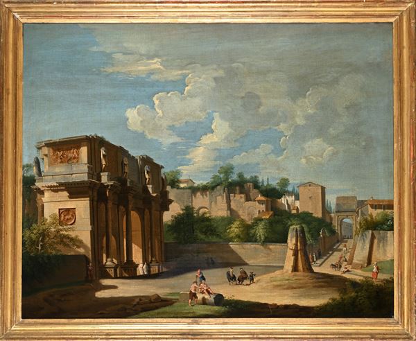 Veduta di Roma con l'Arco di Costantino, la Meta Sudans e l'Arco di Tito sullo sfondo