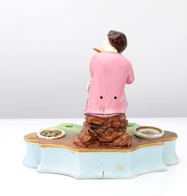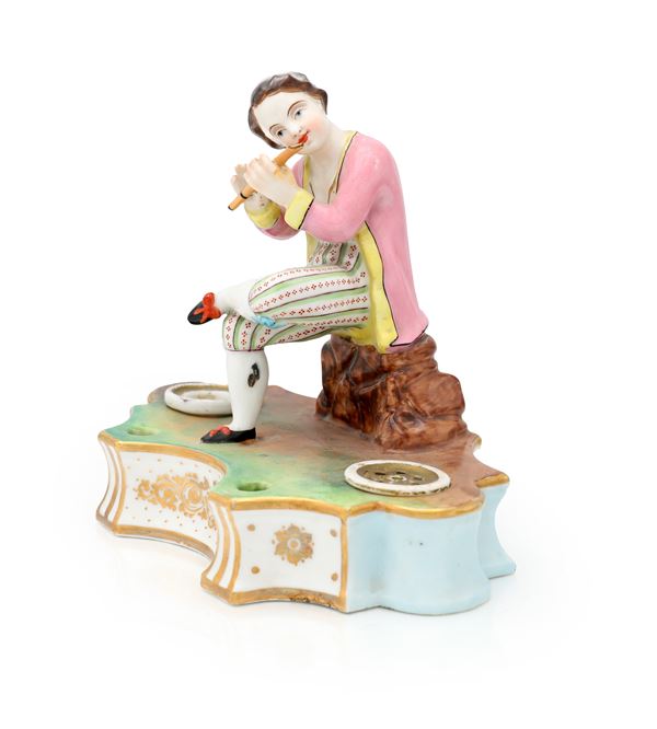 Calamaio in porcellana policroma con figura di suonatore di flauto, Francia, XIX secolo