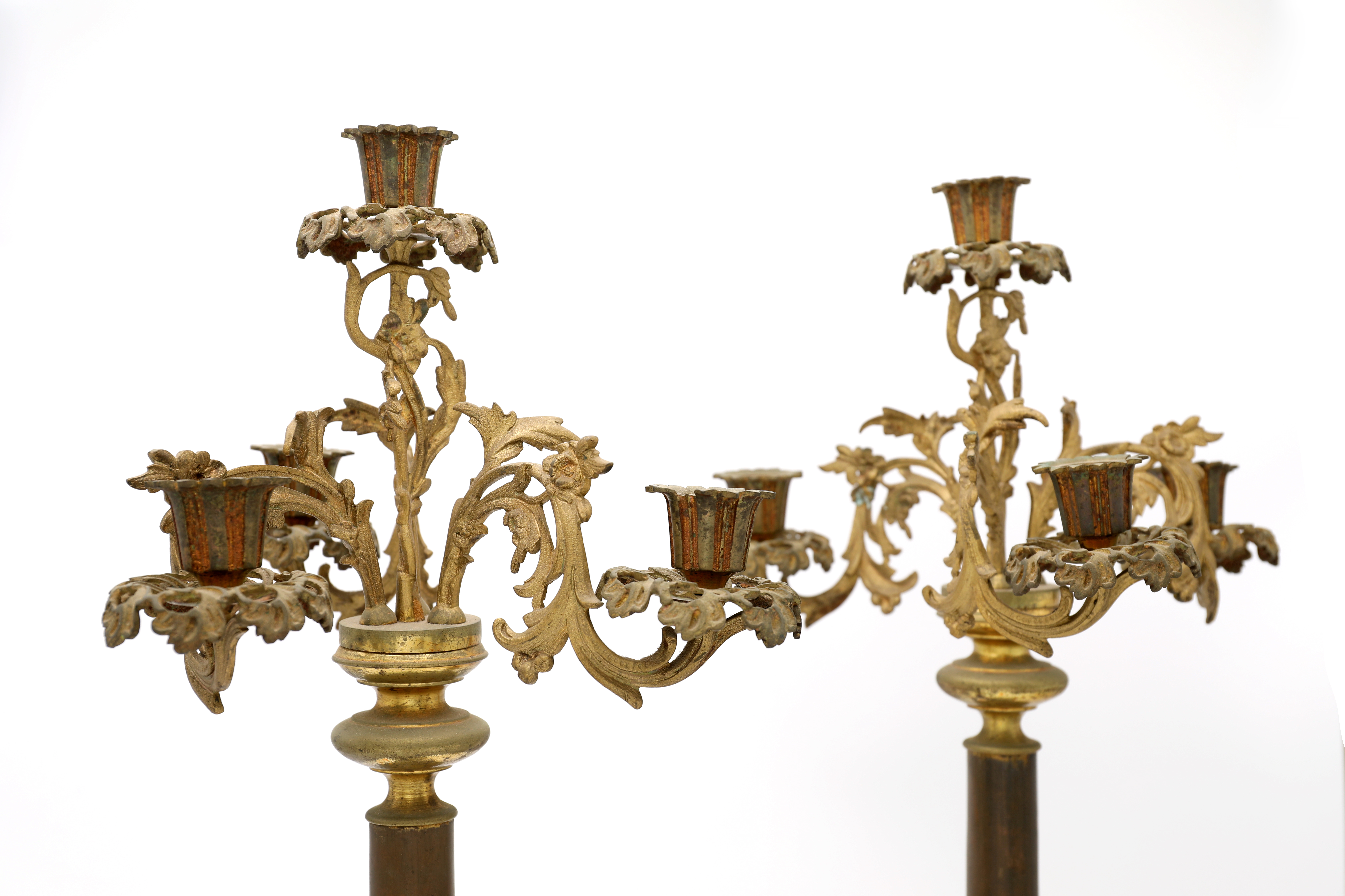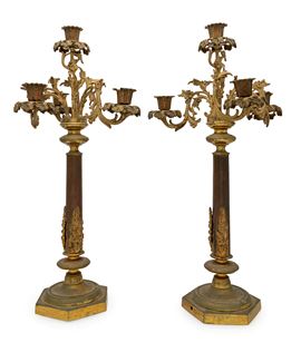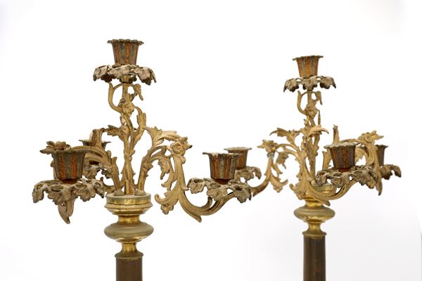 Coppia di candelabri in bronzo patinato e dorato a quattro luci