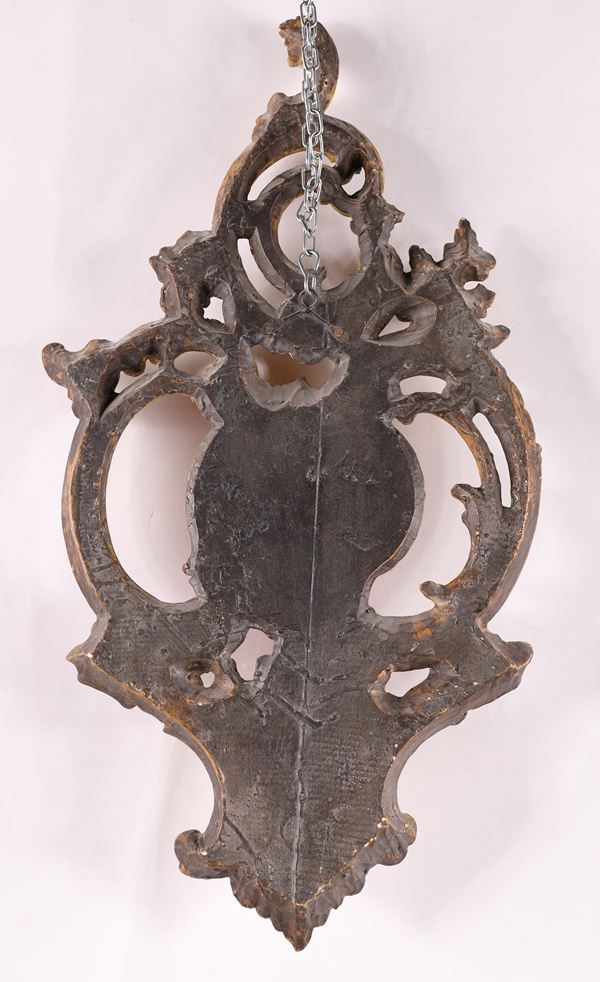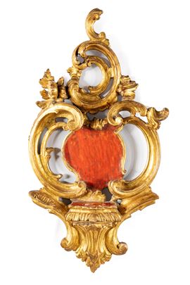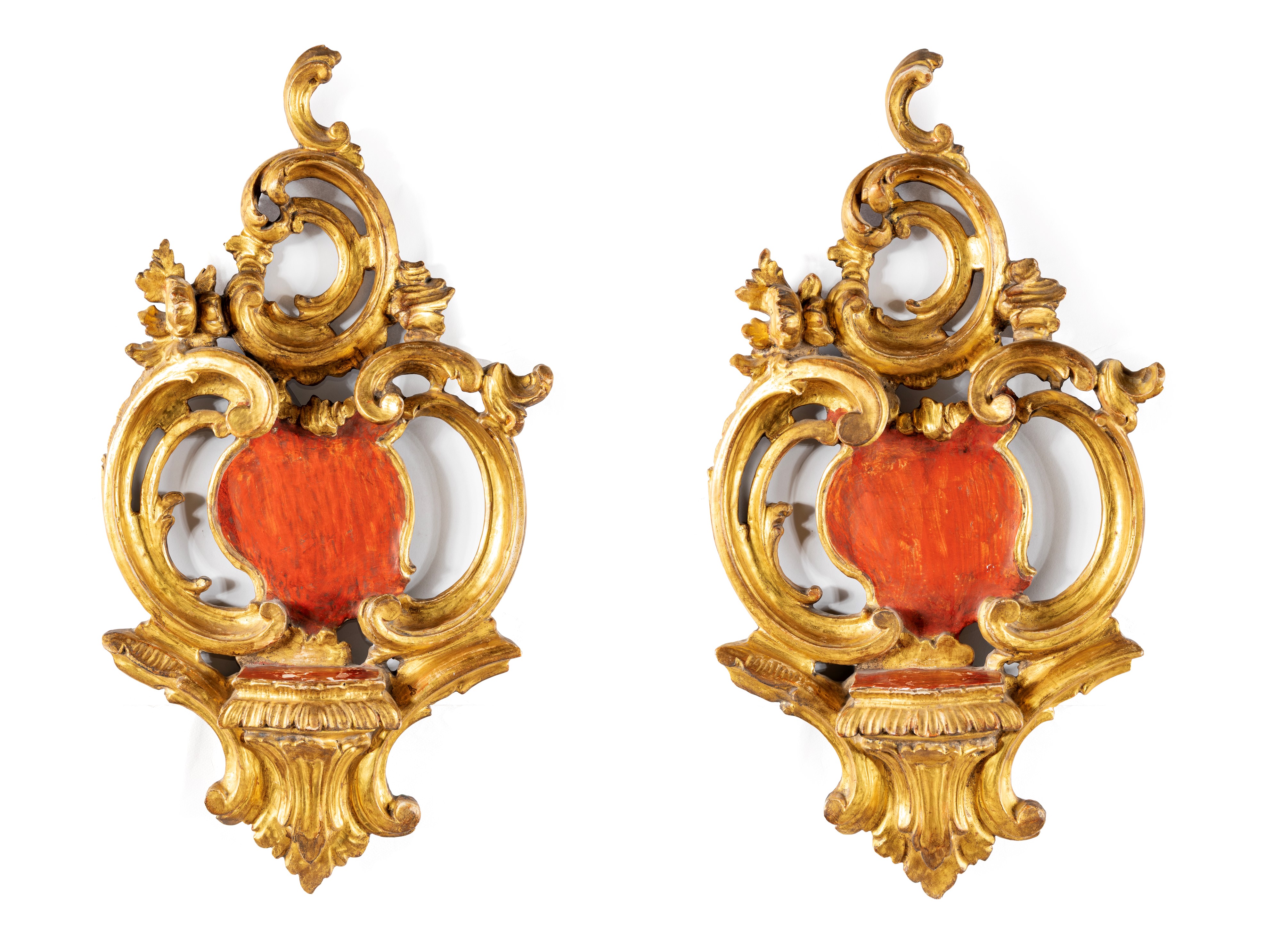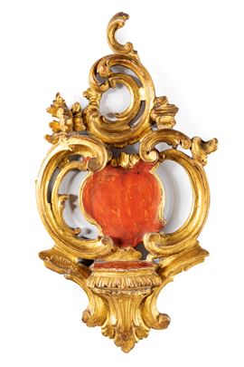 Coppia di fregi con mensola in legno intagliato e dorato