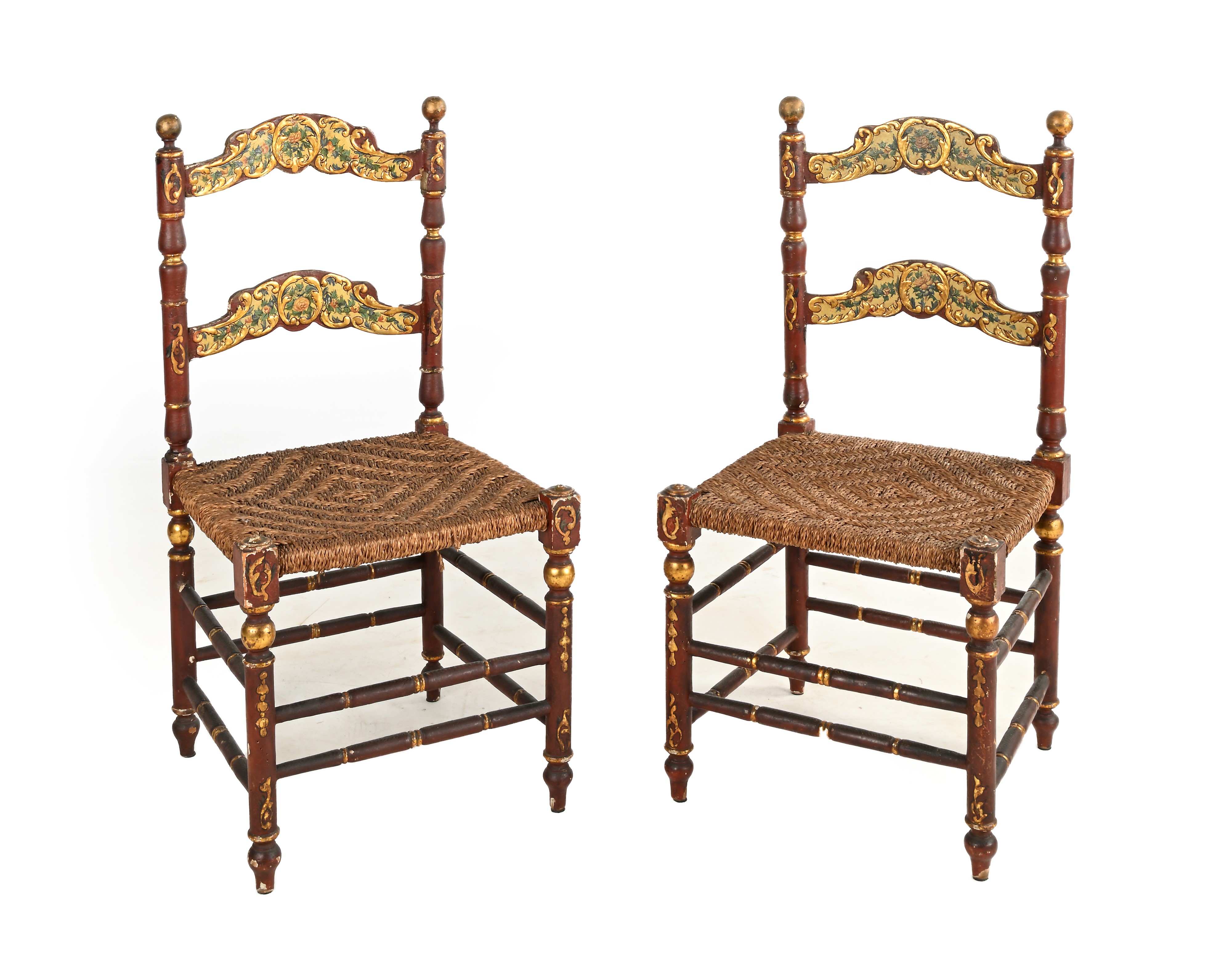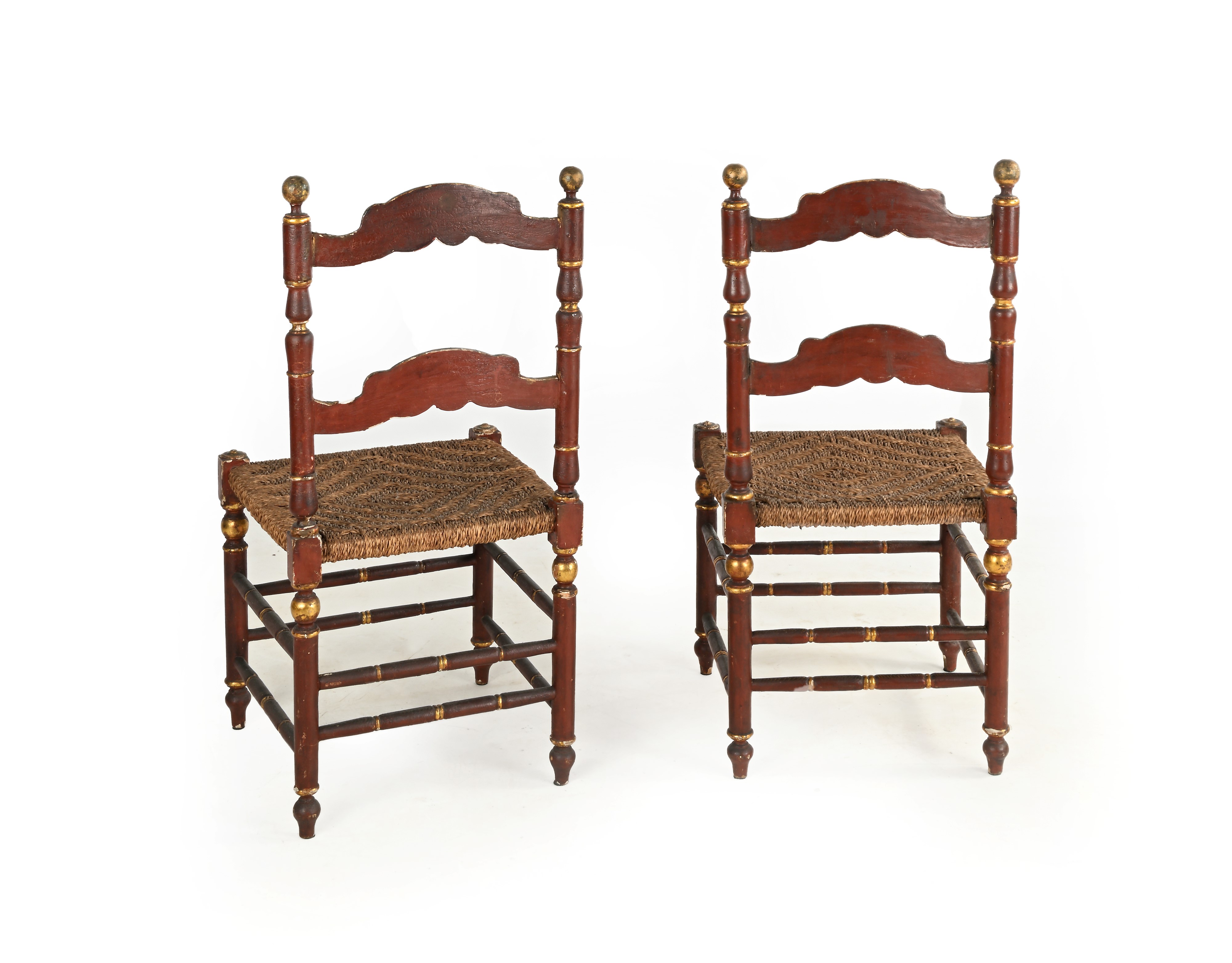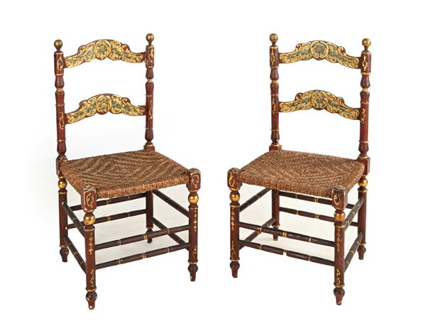 Coppia di sedie in legno laccato rosso scuro, XIX secolo