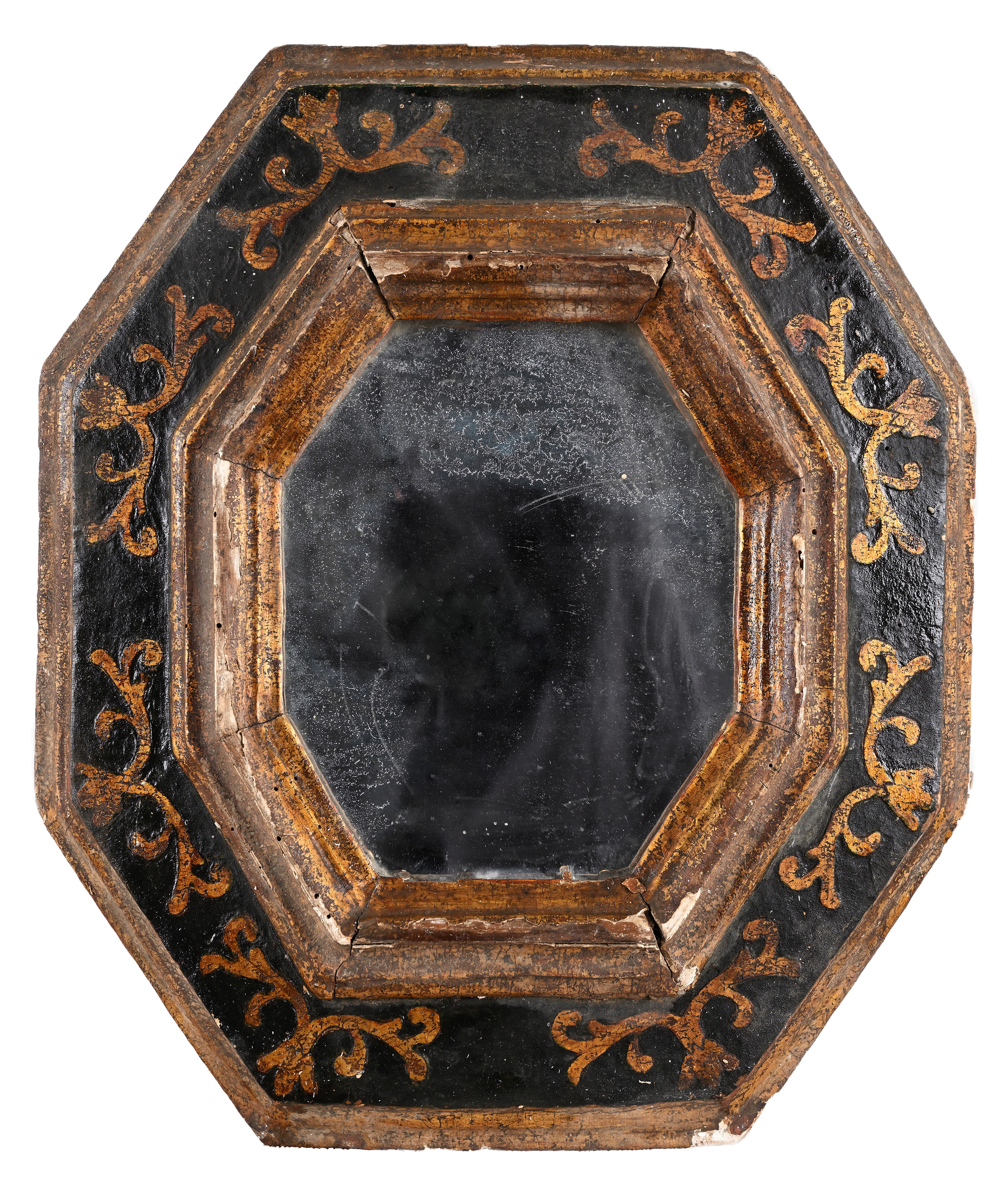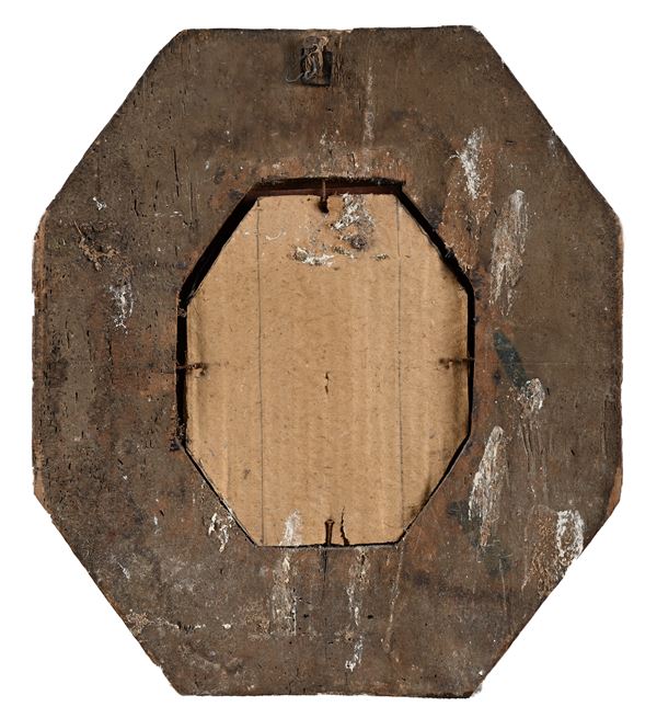 Cornice ottagonale in legno ebanizzato e dorato con specchio, XVII secolo