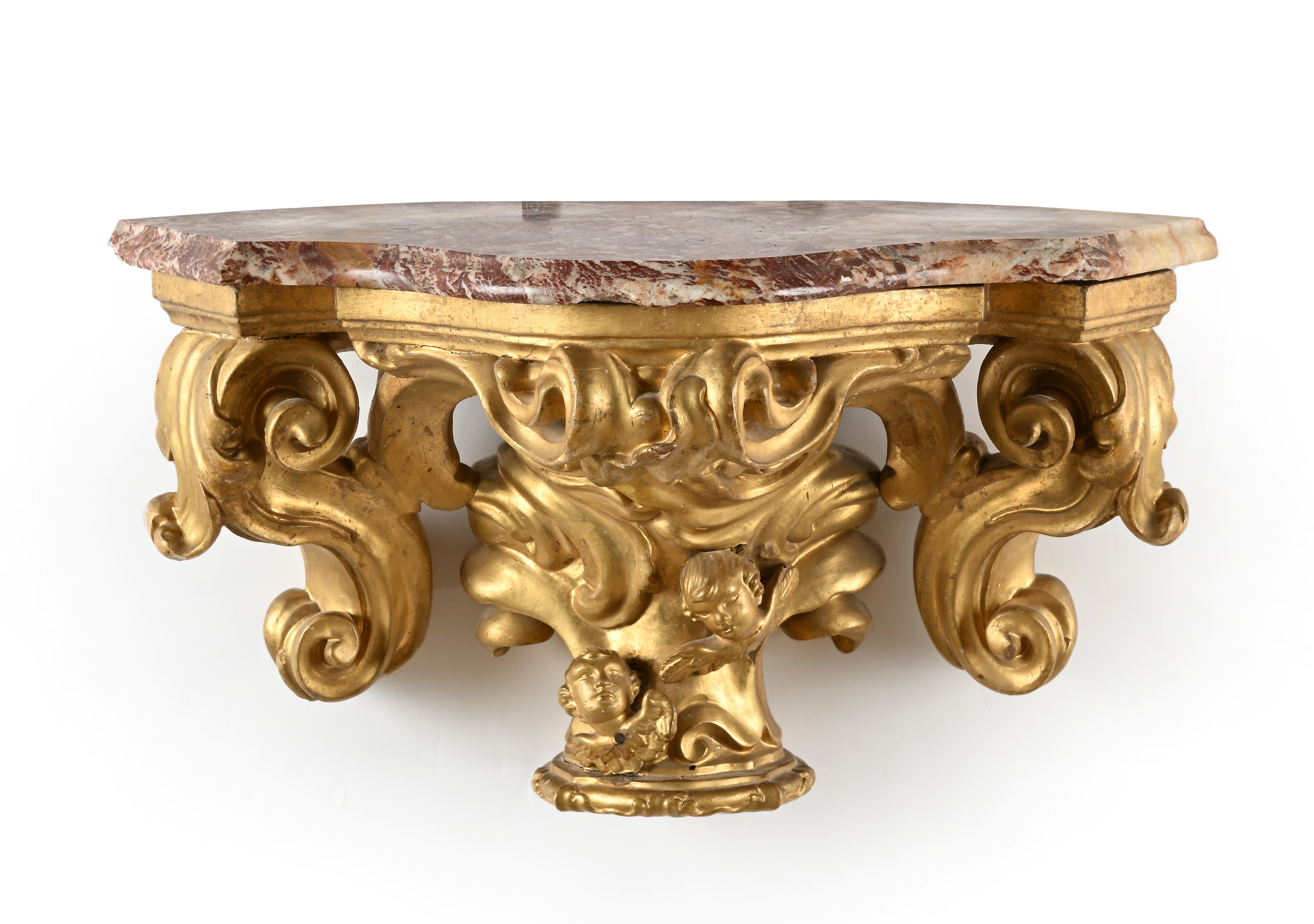 Mensola a goccia in legno scolpito e dorato con piano sagomato in marmo rosso