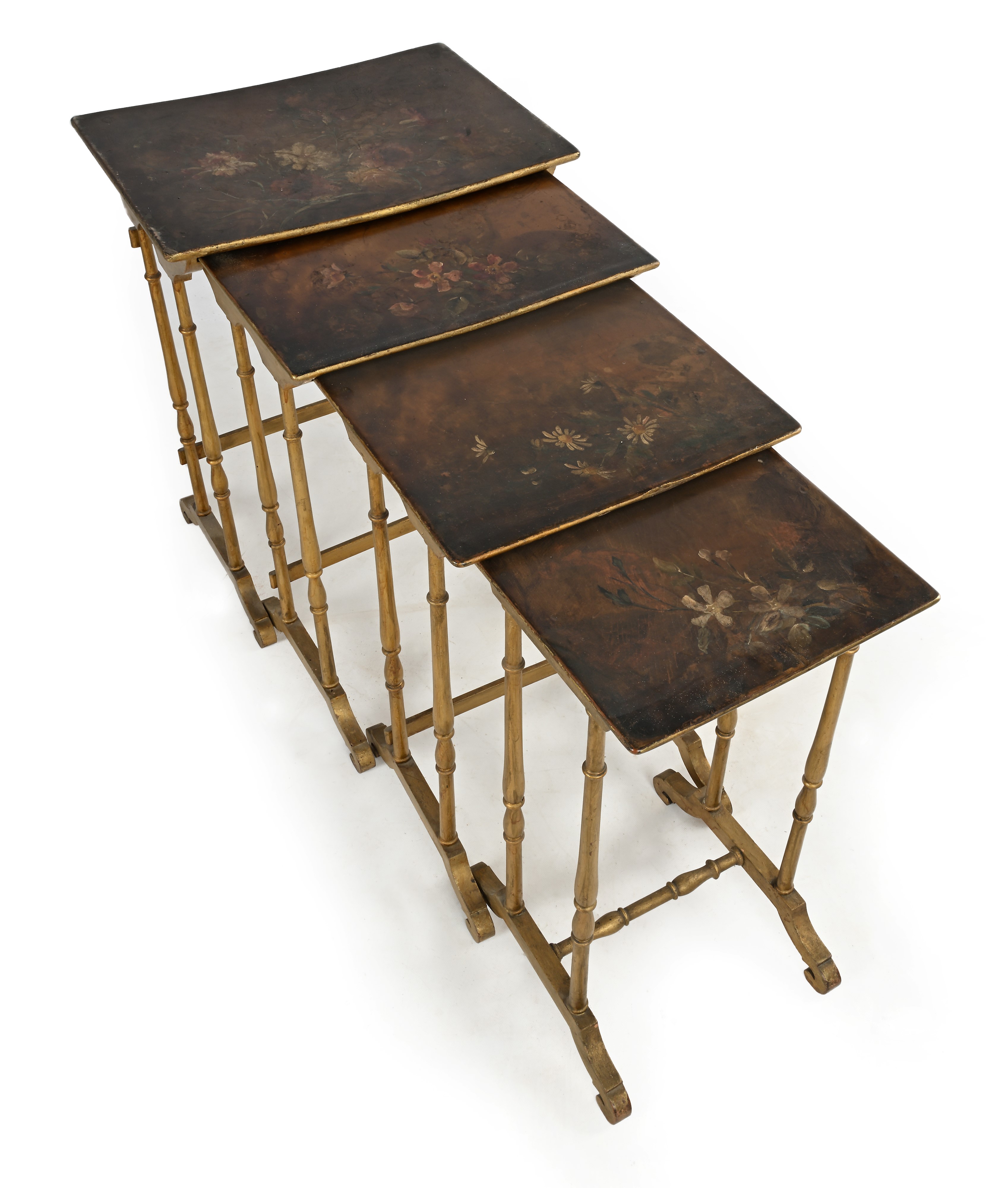 Quattro tavolini a nido in legno dorato con piani rettangolari con fiori dipinti