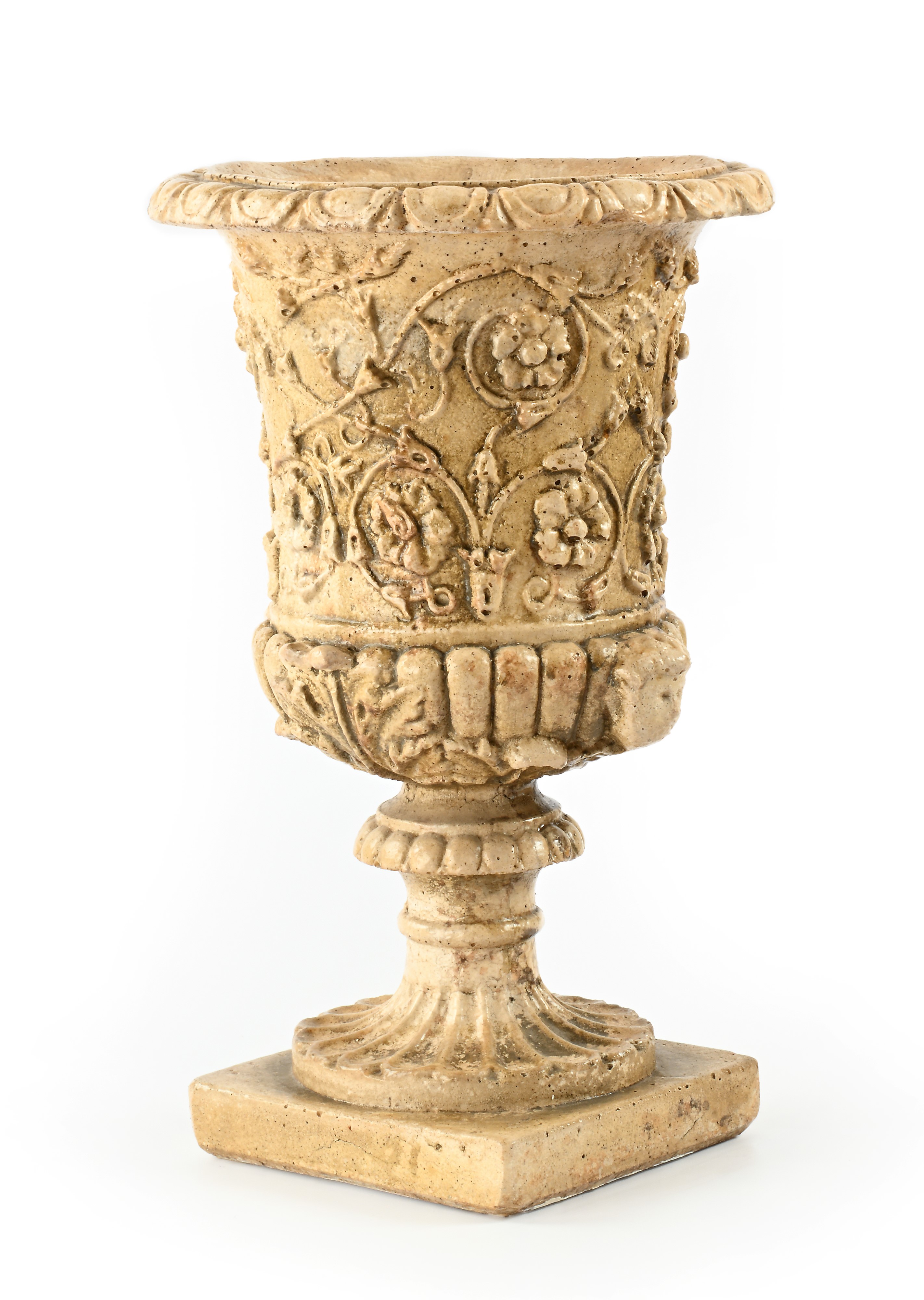 Vaso da giardino in cemento e polvere di marmo con girali e grottesche in rilievo, XX secolo