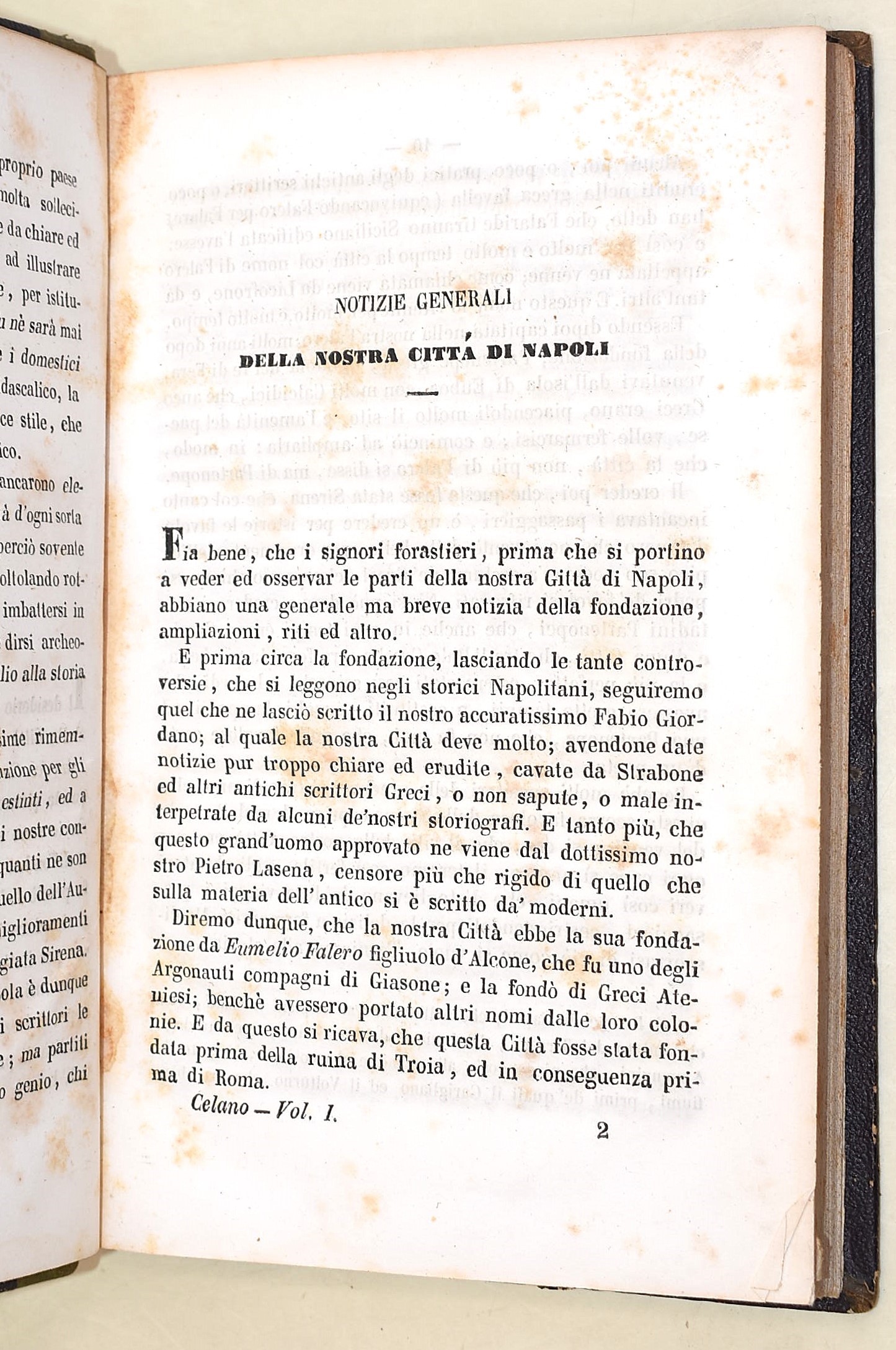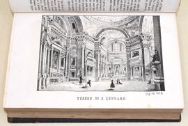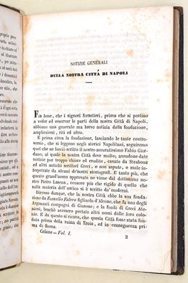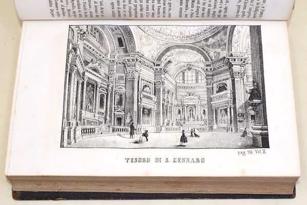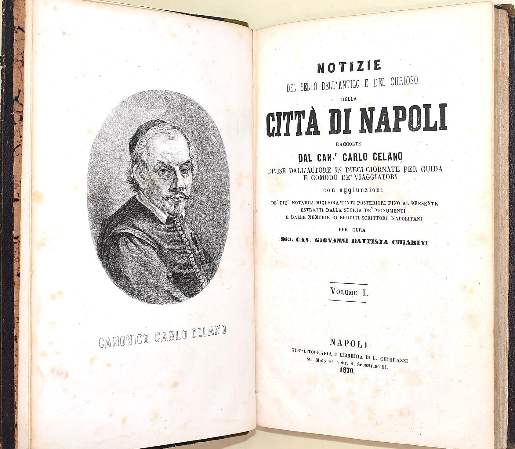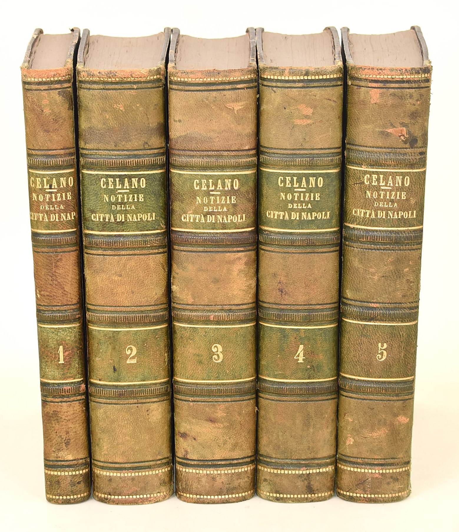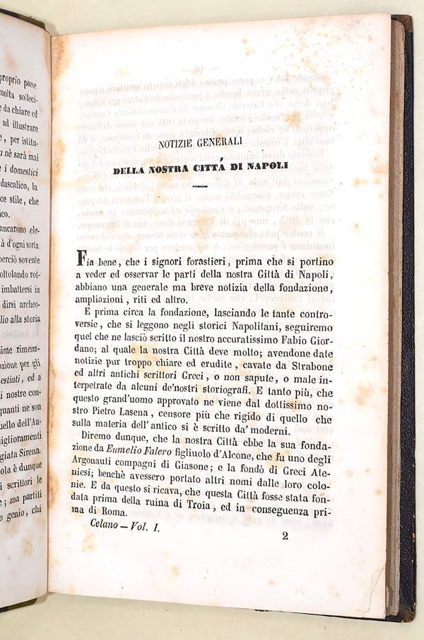 5 volumi, in-4°( 220x145 mm). Pagine: 381 + 1 ritratto all’antiporta e 1 carta ripiegabile in fine / 857 + 7 carte di tav. / 952, (2) / 846 / 858. Legatura coeva in mezza pelle, dorso decorato con titoli e lineature in oro e a secco. Volume ben conservato, in ottimo stato complessivo, con rare e sporadiche fioriture. Antica edizione originale del 1870, impressa in Napoli presso la Tipo-litografia e Libreria di L. Chiurazzi. Completa in 5 volumi. Opera fondamentale della storiografia artistica napoletana, nella quale l’autore descrive con ricchezza di particolari le bellezze artistiche, archeologiche e le curiosità della città di Napoli. Carlo Celano (ca. 1617–1693), sacerdote ed erudito, è considerato una delle principali fonti per la conoscenza della topografia e dei monumenti della Napoli barocca.