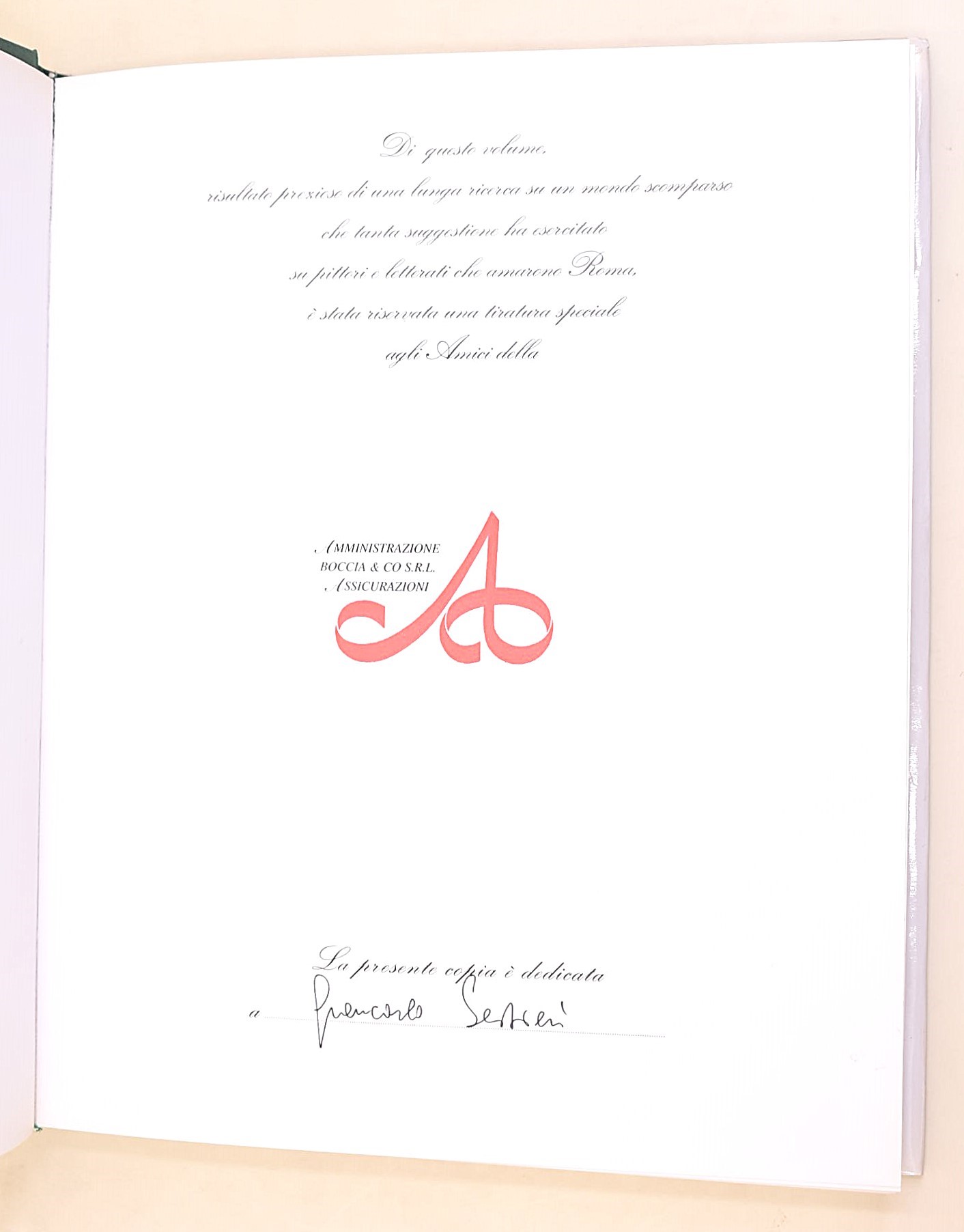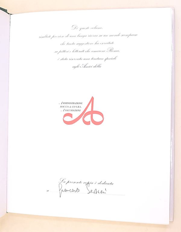 De Rosa, Pier Andrea - Trastulli, Paolo Emilio: La campagna romana. Cento dipinti tra fine settecento e primo novecento, Roma, Edizioni Studio Ottocento, 1999. In-4° (307x250 mm). Pagine: 269. Copertina rigida in piena tela editoriale con sovracoperta. Catalogo d’arte riccamente illustrato. Ottimo stato di conservazione. Prima edizione. Copia dedicata a Giancarlo Sestieri.