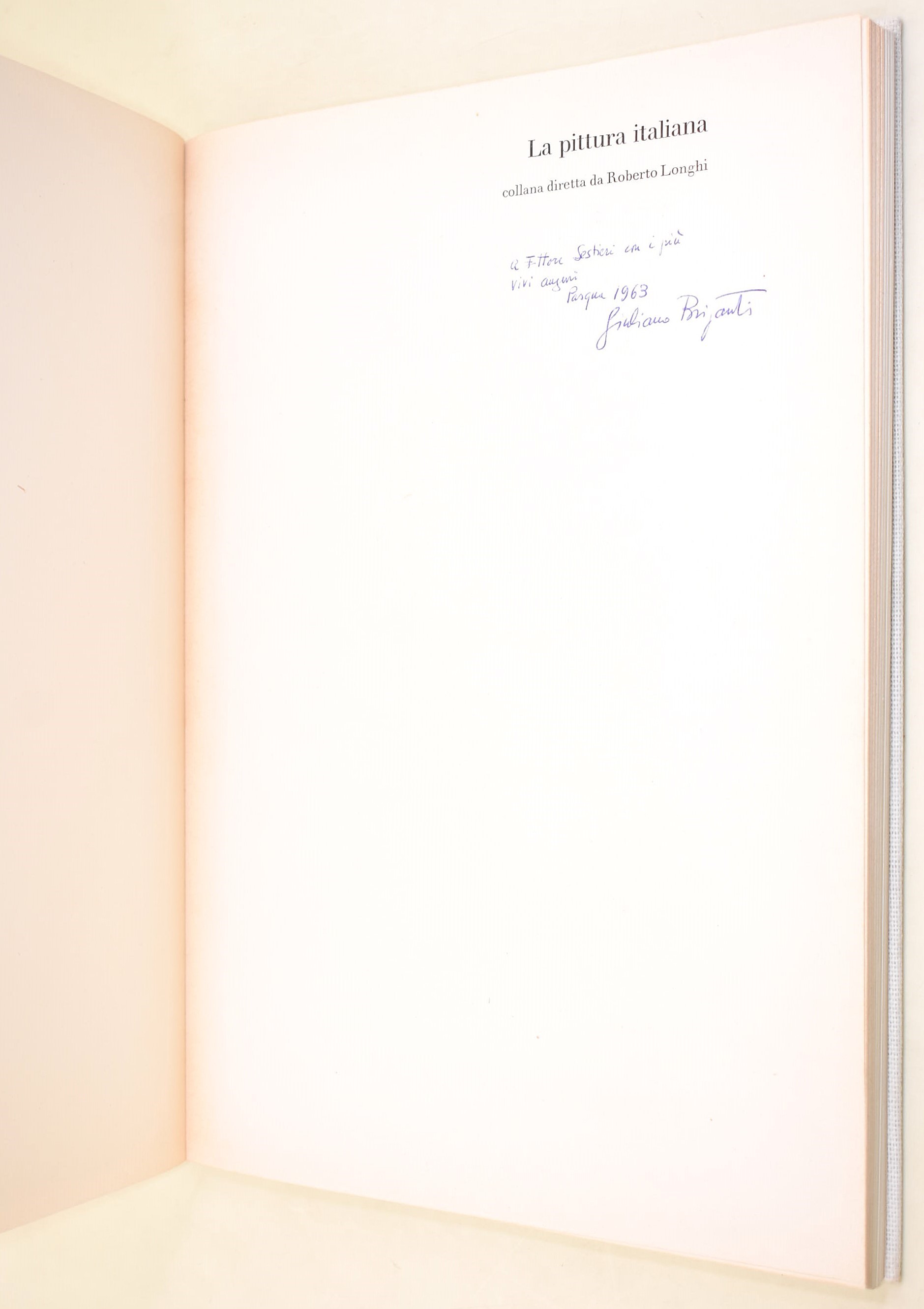 Monografia fondamentale di Giuliano Briganti dedicata al Manierismo italiano, analizzato come stagione autonoma e coerente della cultura figurativa del Cinquecento. Inserita nella collana La Pittura Italiana diretta da Roberto Longhi, l’opera propone una lettura innovativa della “maniera” come linguaggio colto, raffinato e consapevole. Prima edizione, esemplare con dedica autografa dell’autore a Ettore Sestieri (Pasqua 1963), elemento di particolare interesse collezionistico.