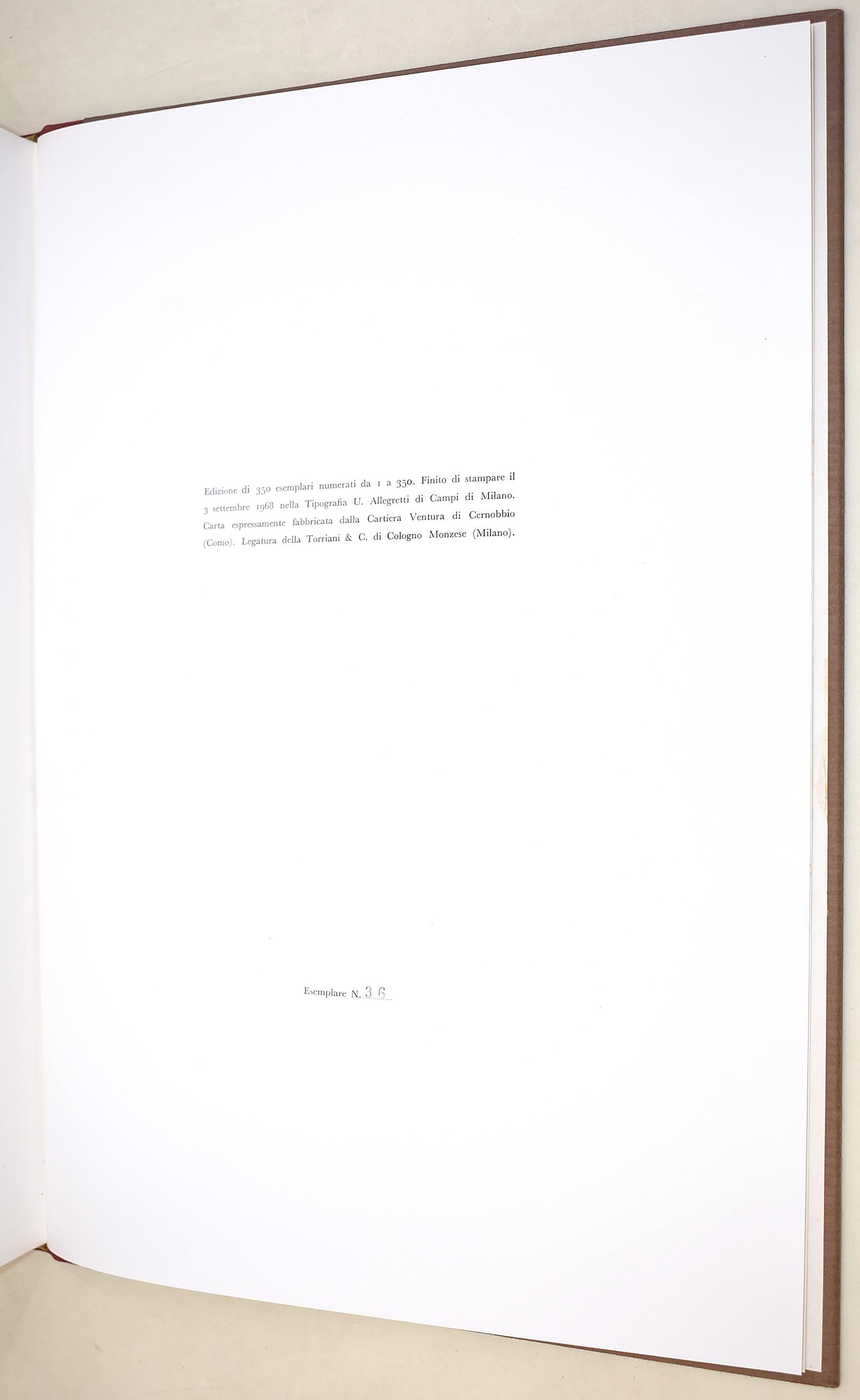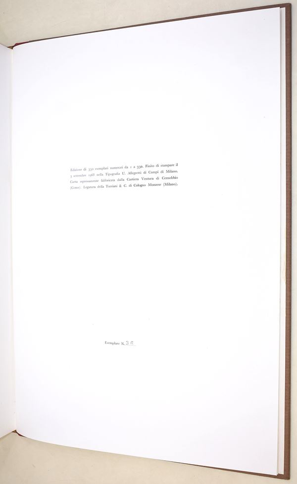 Milano, Edizioni di Vanni Scheiwiller, 1968. In-4° (345x247 mm). Pagine: 93 + 10 tavole apposte con cornice. A cura di Piero Chiara. Copertina in mezza pelle con cofanetto. Esemplare n. 36 di 350. Ottimo stato complessivo.