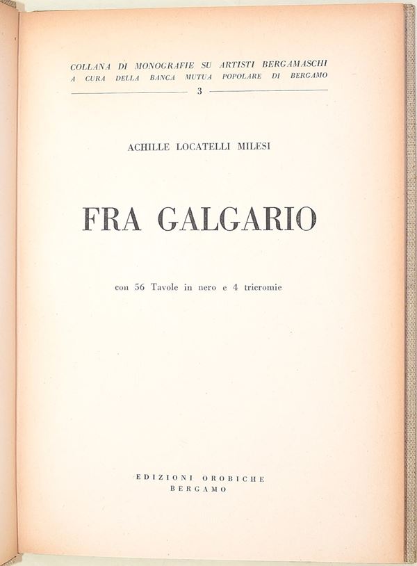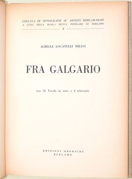 Monografia di Achille Locatelli Milesi dedicata a Fra Galgario (Vittore Ghislandi), celebre ritrattista attivo a Bergamo tra Sei e Settecento. Il volume ripercorre la figura e l’opera dell’artista, evidenziandone la straordinaria capacità di indagine psicologica nei ritratti e il ruolo nella pittura lombarda del tempo. Corredato da un ricco apparato di tavole illustrative, costituisce un contributo significativo agli studi sul maestro bergamasco.