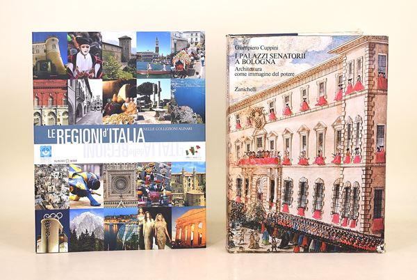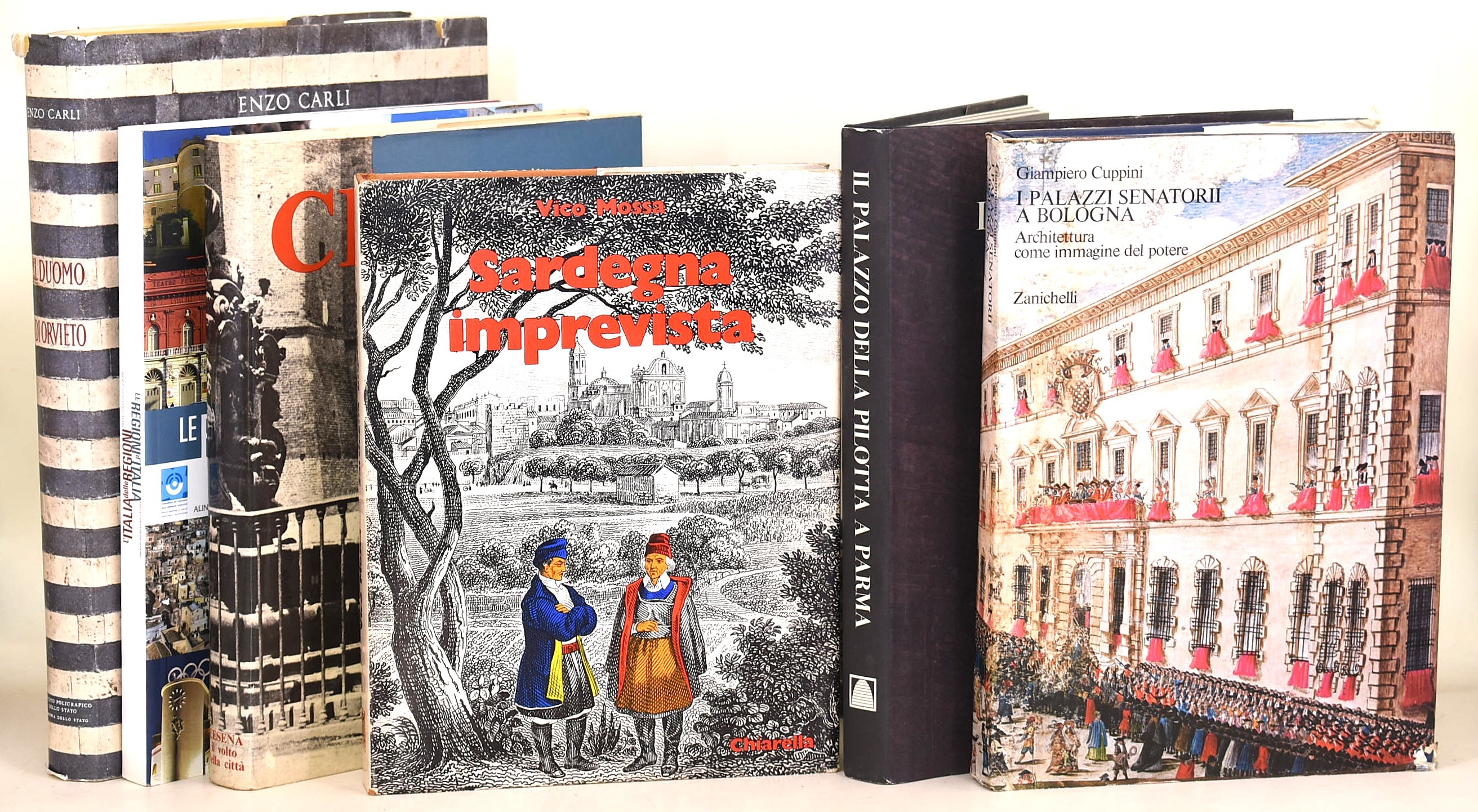 Mossa, Vico: Sardegna imprevista, Sassari, Chiarella, 1975. In-4° (282x223 mm). Pagine: 196. Copertina rigida in piena tela con sovracoperta. Edizione illustrata. Ottimo stato complessivo. L’Italia delle Regioni nelle Collezioni Alinari - Le Regioni d’Italia nelle Collezioni Alinari, Firenze, Alinari, 2011. 2 opere in un unico volume. Pagine: 143 / 125. Brossura editoriale. Edizione illustrata. Ottimo stato di conservazione. Cesena. Il volto della città, Bologna, Edizioni Alfa Bologna - Banca Popolare di Cesena, 1973. A cura di Biagio Dradi Maraldi e Andrea Emiliani. Copertina rigida in piena tela con sovracoperta. Edizione illustrata. Esemplare n. 832. Ottimo stato complessivo. Cuppini, Giampiero: I Palazzi Senatorii a Bologna, Bologna, Zanichelli, 1974. In-4° (305x216 mm). Pagine: 328. Copertina rigida in piena tela con sovracoperta. Edizione illustrata. Buono stato complessivo, ad eccezione di piccoli difetti alla sovracoperta. Il Palazzo della Pilotta a Parma, Cassa di Risparmio di Parma e Piacenza - Franco Maria Ricci, 1996. In-4° (303x235 mm). Pagine: 252. Copertina rigida con sovracoperta. Edizione illustrata. Ottimo stato complessivo. Carli, Enzo: Il Duomo di Orvieto, Roma, Istituto Poligrafico dello Stato - Libreria dello Stato, 1965. In-4° (352x255 mm). Pagine: 148. Copertina rigida in piena tela con sovracoperta. Edizione illustrata. Buono stato complessivo, ad eccezione di lievi difetti alla sovracoperta.